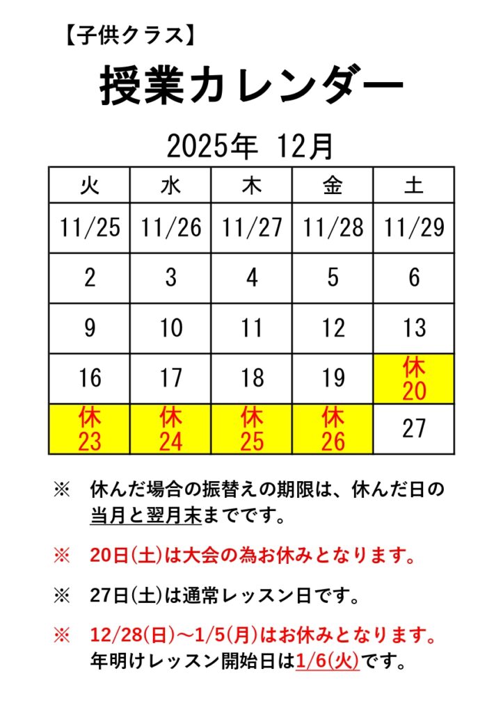 2025-10-28 【子どもクラス】2025年12月授業カレンダー 2025年12月の授業カレンダーを当教室入口で配布しております。 ご来館時にお持ち帰りください。 ※大人クラス・男子新体操クラスはこの授業カレンダーとは異なります。 【子どもクラス】2025年11月授業カレンダー