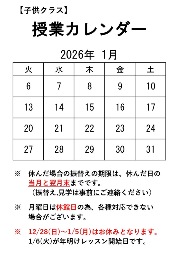 2025-11-25 【子どもクラス】2026年1月授業カレンダー 2026年1月の授業カレンダーを当教室入口で配布しております。 ご来館時にお持ち帰りください。 ※大人クラス・男子新体操クラスはこの授業カレンダーとは異なります。 【子どもクラス】2025年12月授業カレンダー