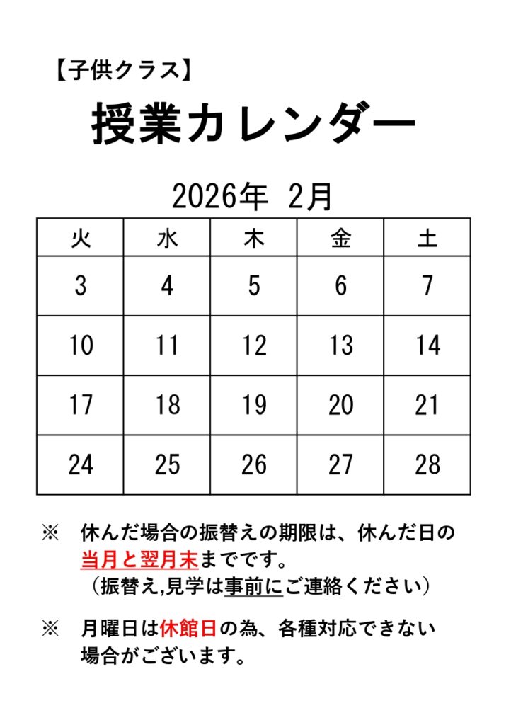 2026-01-06 【子どもクラス】2026年2月授業カレンダー 2026年2月の授業カレンダーを当教室入口で配布しております。 ご来館時にお持ち帰りください。 ※大人クラス・男子新体操クラスはこの授業カレンダーとは異なります。 【子どもクラス】2026年1月授業カレンダー