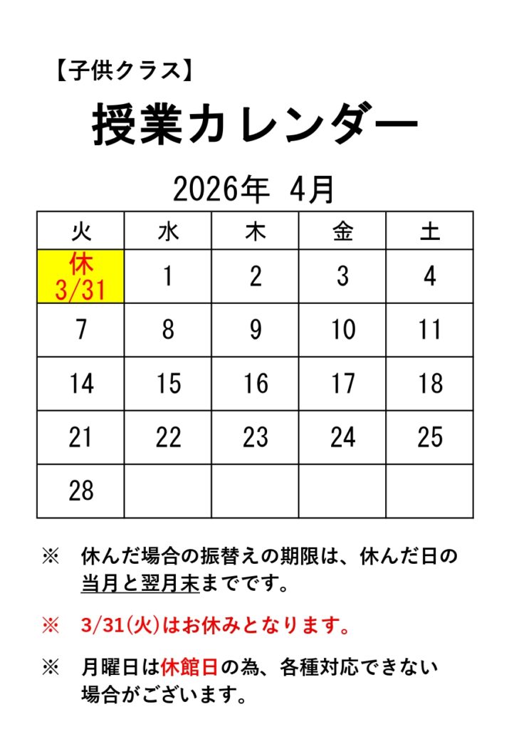 2026-03-03 【子どもクラス】2026年4月授業カレンダー 2026年4月の授業カレンダーを当教室入口で配布しております。 ご来館時にお持ち帰りください。 ※大人クラス・男子新体操クラスはこの授業カレンダーとは異なります。 【児童通所支援】2025年度 児童発達支援・放課後等デイサービス自己評価表を公表しました 【重要】当教室からのお願い